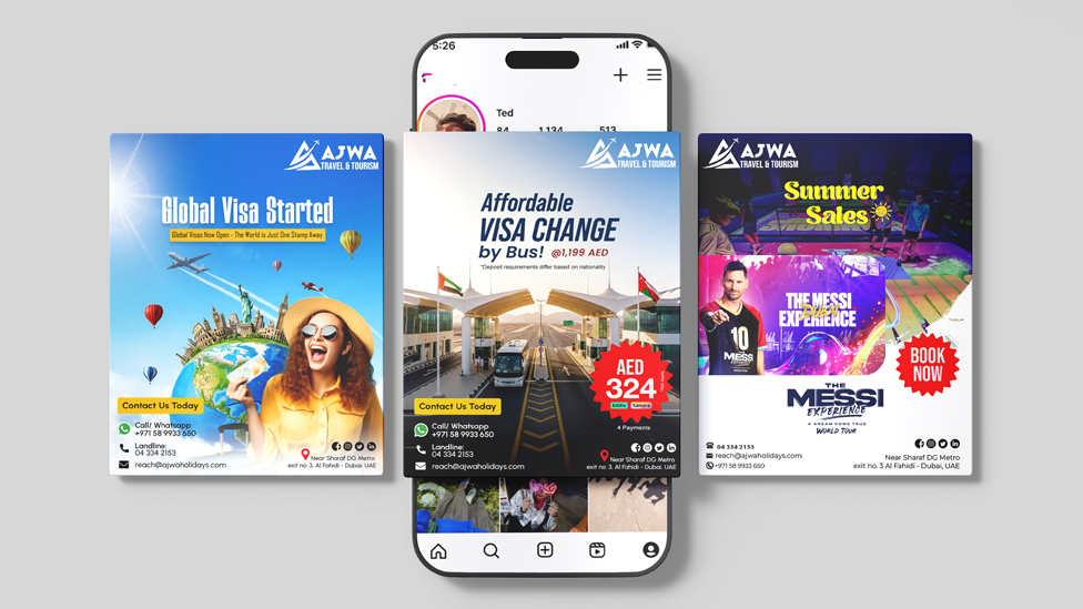 We crafted eye-catching digital campaigns for Ajwa Travel & Tourism, focusing on travel promotions, visa services, and seasonal offers. Through creative designs, engaging content, and targeted strategies, the campaigns boosted visibility, increased engagement, and attracted more bookings across social media platforms.
